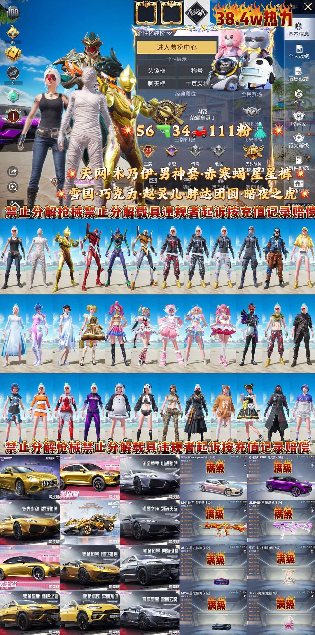112粉,34载具,460套装,21王牌印记-UZI-绮梦青鸾/AKM-甜心宝贝/DP-28-扶摇飞仙/SCAR-L-梦幻火箭/SCAR-L-童趣迷兔/Kar98K-伏魔团/SKS-碧影闪光/M416-风花雪月/AUG-星之彼岸/SCAR-L-甜梦小狐/AWM-花间之火/M762-甜心娃娃/汤姆逊-怪笑疯兔/AWM-焰龙焚天/Vector-红伞翩翩/P90-甜蜜草莓/MG3-炙焰牛王/Kar98K-巳巳如意/M762-激战未来/GROZA-香水柠檬/M416-暖熊萌萌/Kar98K-圣光天使/M416-心之恋语/平底锅-林间仙鹿/M16A4-葫芦兄弟/Mini14-荧光虫舞/M416-五爪金龙/M24-暗星紫秘/DP-28-枪炮玫瑰/M24-翩跹演武/M16A4-垂柳戏鸭/AKM-炫紫旋律/Mini14-绚金瑰梦/MG3-洛神天依/GROZA-焦糖拿铁/SCAR-L-青春物语/M249-古战神甲/AKM-百合蜜语/UZI-筑梦精灵/M416-至情至圣/SLR-暗夜玫瑰/S12K-海渊国主/VSS-烈焰拳霸/Kar98K-暗翼战神/UMP45-雪国精灵/M762-甜蜜誓约/UMP45-相