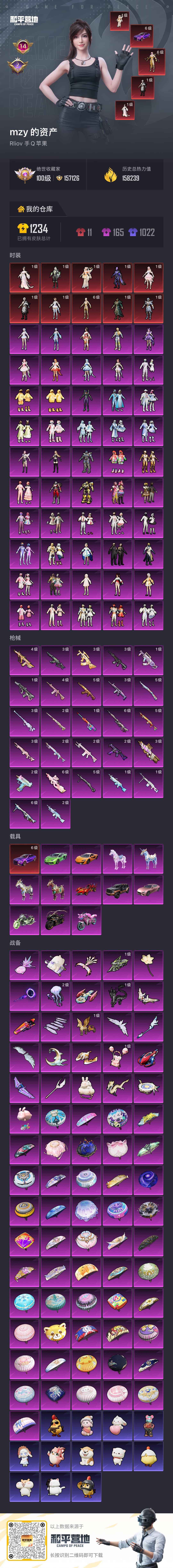 59粉,13载具,178套装,8王牌印记 M417-第五大道/UZI-绮梦青鸾/AKM-甜心宝贝/SCAR-L-梦幻火箭/M249-彩虹甜喵/-PKM-天星战神/Mk14-盛世惊鸿/Kar98K-巳巳如意/GROZA-巴啦啦小魔仙/Mk14-精灵梦叶罗丽/AKM-幽焰骑士/UMP45-宇宙意志/M416-心之恋语/M24-镜域双华/AMR-炫光之旅/P90-粉樱探戈/M200-玉鳞金羽/GROZA-精灵之光/MG3-洛神天依/M416-墨龙九天/M200-梦海之灵/M249-绒雪飘舞/AUG-超新星/P90-沙丘之主/兰博基尼Aventador(翡翠绿)/疾风龙骑/乔治·巴顿战车(鎏金黑)/迈凯伦570S(旭日黄)/双人摩托-梦幻火箭/星梦玉骢/焰龙咆哮/宾利飞驰(皇家紫)/幽焰风驰摩托车/关羽赤兔马/赵云玉狮子马/晶梦灵驹/玛莎拉蒂Ghibli(粉)/