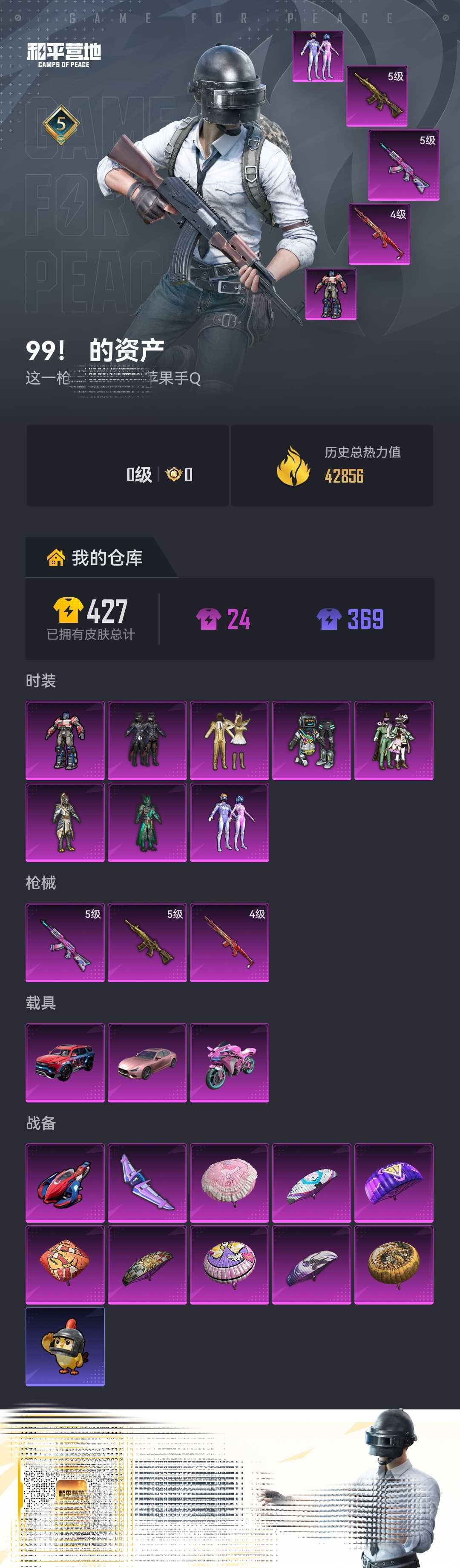【粉色枪皮等级】:AKM-炫紫旋律(五级),M416-五爪金龙(五级),Mini14-龙虾霸霸(四级)