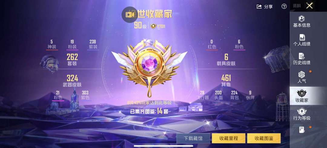 90级收藏家,5红装,1五级,19粉装,21特效枪,6载具,1僚机露米娜黄金木乃伊凤凰哪吒灵猫