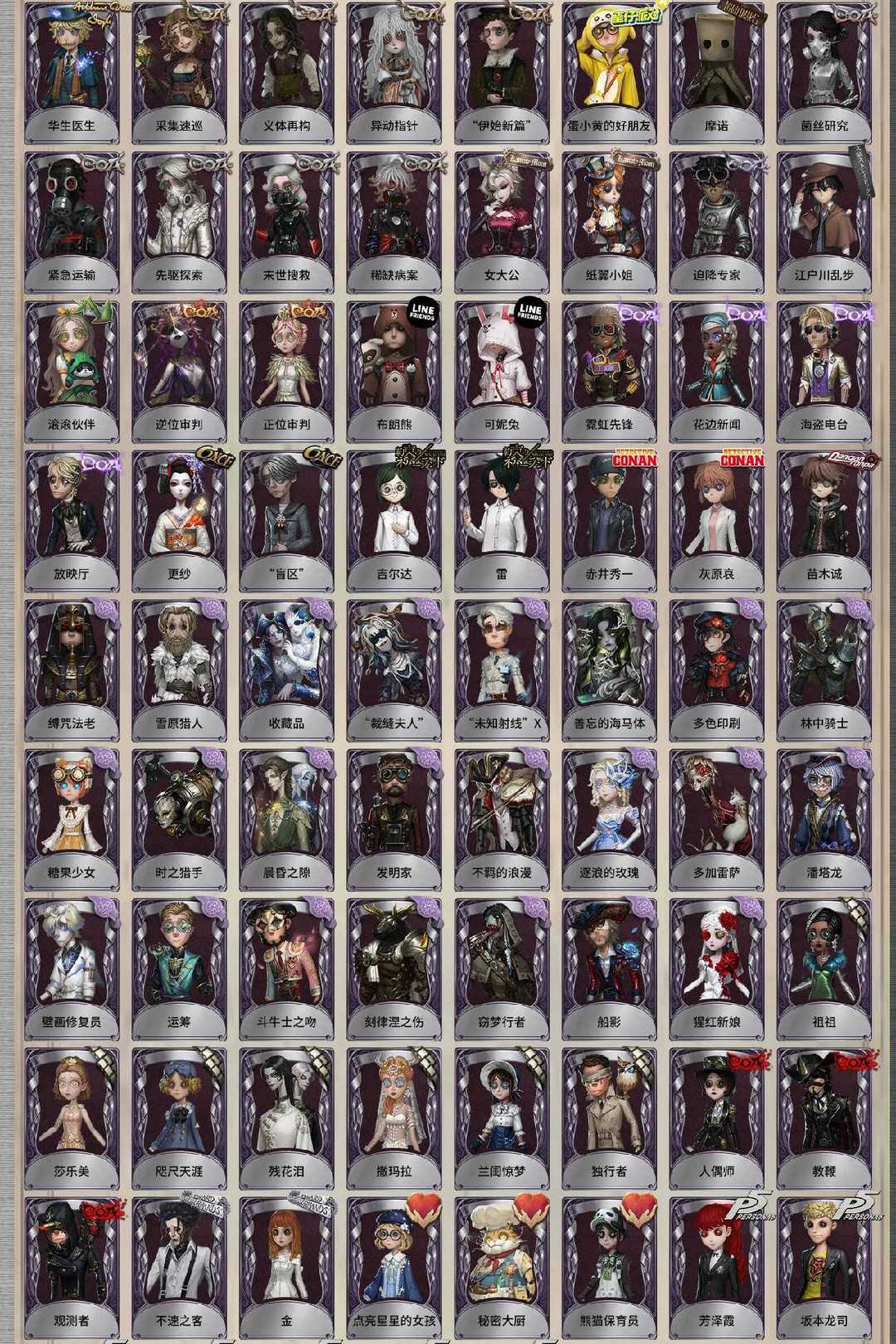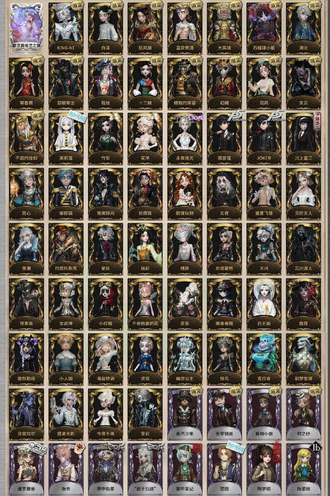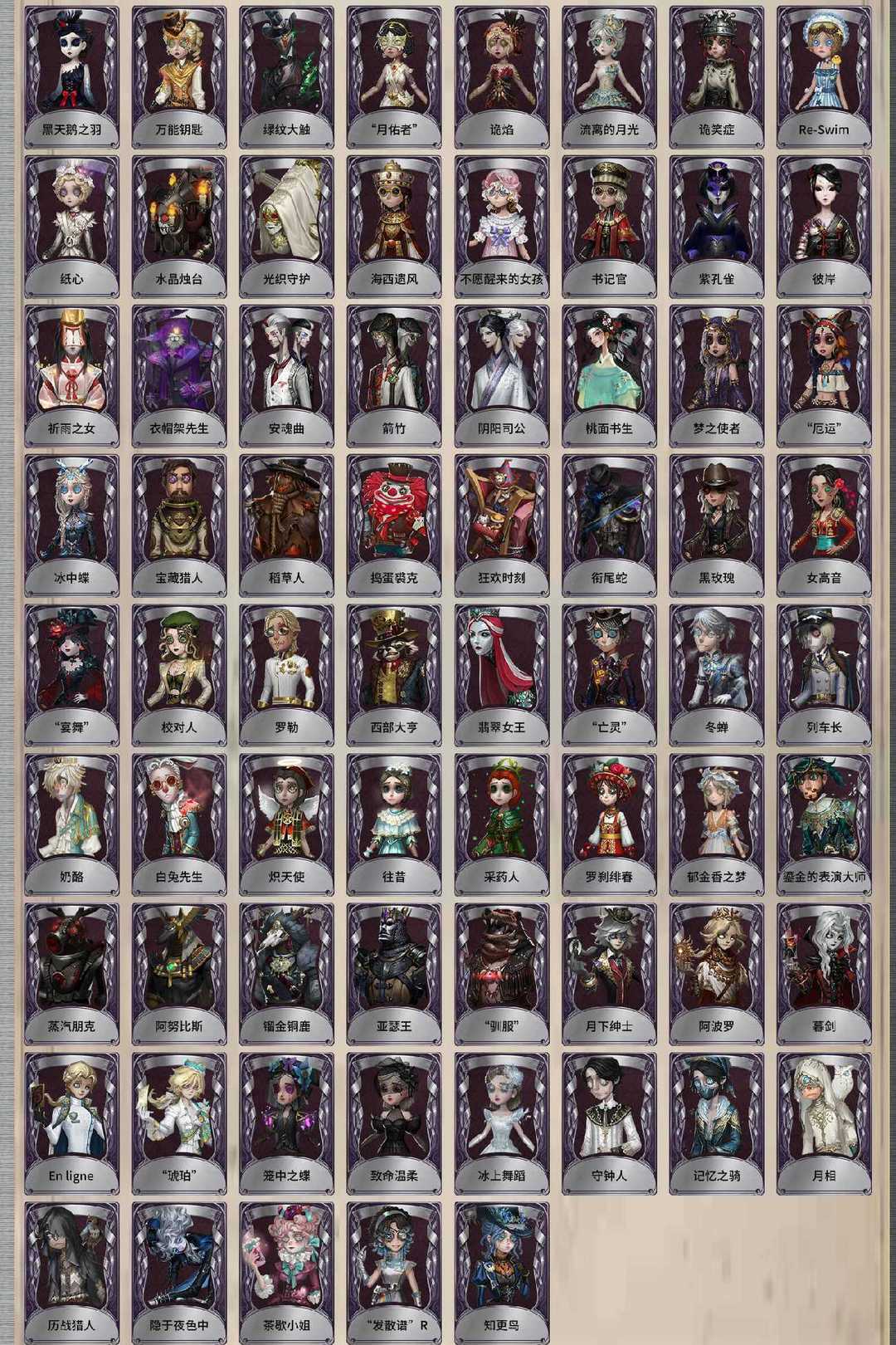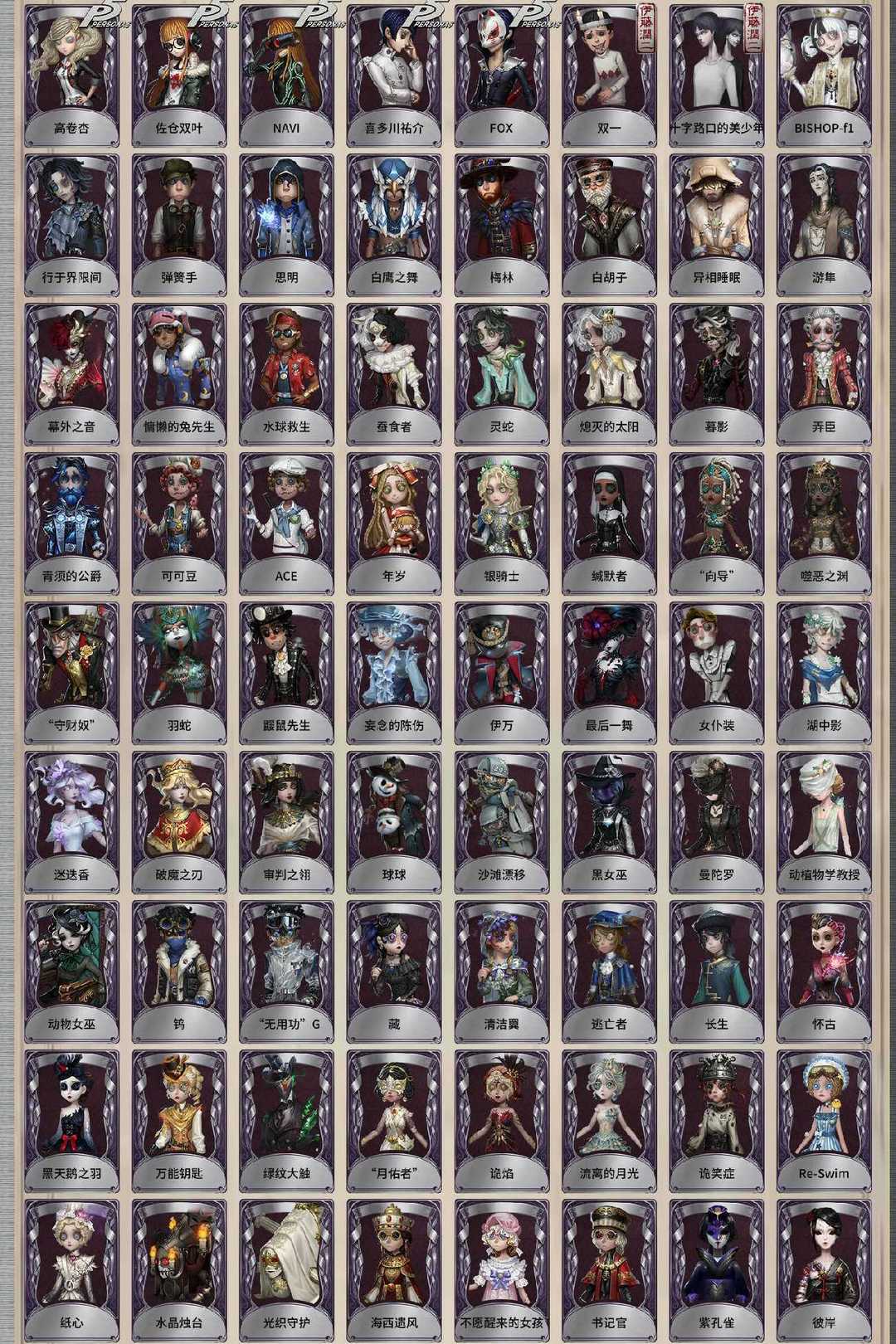 摩涅莫绪涅之梦 精致的笑容 司药 邪眼寄主 翦烛 寒香舞 十三娘 不屈的信仰 大英雄 初拥 溯光 石榴碟小姐 白泽 招风旗 温泉煮酒 KING-h1 灰云 未至之人 川上富江 雨宫莲 JOKER 永夜极光 竹华 花序 芙莉莲 拉塔托斯克 流萤 幽灵公主 怪鸟 小人国 柴郡猫 忘川渡人 夜来香 尼德霍格 天河 小红帽 不会枯萎的花 女武神 花祭 暗金蛋糕 白无垢 胧夜 摩根勒菲 今夜不再 亚兹拉尔 盛夏光影 变彩 贝拉夫人 夜潮 耶梦加得 盛夏飞盘 祈雨珠 海盐特调 缚愿 星辰 瑶彩 长夜 欧律狄刻 克拉肯 首席顾问 筠心 片刻闲暇 真相小姐 光学镜面 蒸汽少年 时之砂 双一 十字路口的美少年 佐仓双叶 NAVI 高卷杏 坂本龙司 喜多川祐介 FOX 芳泽霞 熊猫保育员 点亮星星的女孩 秘密大厨 不速之客 金 人偶师 教鞭 观测者 兰闺惊梦 咫尺天涯 莎乐美 残花泪 撒玛拉 独行者 祖祖 “未知射线”X 运筹 刻律涅之伤 发明家 缚咒法老 林中骑士 糖果少女 时之猎手 晨昏之隙 猩红新娘 牛仔-船影 “裁缝夫人” 窃梦行者 雪原猎人 逐浪的玫瑰 潘塔龙 多加雷萨 壁画修复员 不羁的浪漫 善忘的海马体 多色印刷 收藏品 苗木诚 赤井秀一 灰原哀 吉尔达 雷 更纱 “盲区” 霓虹先锋 花边新闻 海盗电台 放映厅 布朗熊 可妮兔 正位审判 逆位审判 滚滚伙伴 江户川乱步 迫降专家 女大公 纸翼小姐 稀缺病案 末世搜救 先驱探索 菌丝研究 紧急运输 摩诺 蛋小黄的好朋友 异动指针 “伊始新篇” 采集速巡 义体再构 华生医生 梅爱丽 陶梦嫣 赞因 掌中篆记 “巡于归途” 匣中焰星 兔爷 暹罗厘普 亚瑟王 “驯服” 稻草人 捣蛋裘克 女仆装 炽天使 往昔 采药人 白兔先生 鎏金的表演大师 罗刹绯春 郁金香之梦 蒸汽朋克 阿努比斯 镏金铜鹿 梅林 白胡子 宝藏猎人 弹簧手 思明 白鹰之舞 绿纹大触 怀古 黑天鹅之羽 万能钥匙 诡笑症 Re-Swim 纸心 “月佑者” 诡焰 流离的月光 慵懒的兔先生 水球救生 水晶烛台 光织守护 海西遗风 不愿醒来的女孩 书记官 紫孔雀 彼岸 祈雨之女 衣帽架先生 安魂曲 箭竹 阴阳司公 桃面书生 梦之使者 “厄运” 冰中蝶 笼中之蝶 致命温柔 冰上舞蹈 月下绅士 阿波罗 暮剑 En ligne “琥珀” 月相 历战猎人 守钟人 入殓师-记忆之骑 “守财奴” 羽蛇 缄默者 “向导” 噬恶之渊 伊万 最后一舞 鼹鼠先生 妄念的陈伤 弄臣 青须的公爵 可可豆 ACE 罗勒 黑玫瑰 女高音 “宴舞” 校对人 西部大亨 “亡灵” 翡翠女王 列车长 奶酪 冬蝉 衔尾蛇 黑女巫 曼陀罗 动植物学教授 动物女巫 球球 沙滩漂移 逃亡者 长生 狂欢时刻 钨 “无用功”G 藏 清洁翼 湖中影 迷迭香 破魔之刃 审判之翎 银骑士 年岁 暮影 蚕食者 灵蛇 熄灭的太阳 飞行家-异相睡眠 游隼 幕外之音 BISHOP-f1 行于界限间 茶歇小姐 隐于夜色中 “发散谱”R 知更鸟