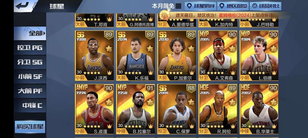 天选字母(有动态典藏海报)❤️点券新拉塞尔(有篮板组合)❤️点券爱德华兹❤️点券艾弗森❤️点券欧文(有德鲁大叔专属潮服)❤️点券新狼王❤️点券热火巴特勒(扑球动作)❤️02点券邓肯❤️新伯德❤️点券约基奇❤️点券雷阿伦❤️点券吉诺比利❤️点券湖人张伯伦❤️点券纳什❤️点券帕克❤️点券韦德❤️点券新皮蓬❤️点券保罗❤️点券哈登(三分狂潮)❤️湖人沃西❤️点券加索尔❤️点券大本❤️点券乐福等……