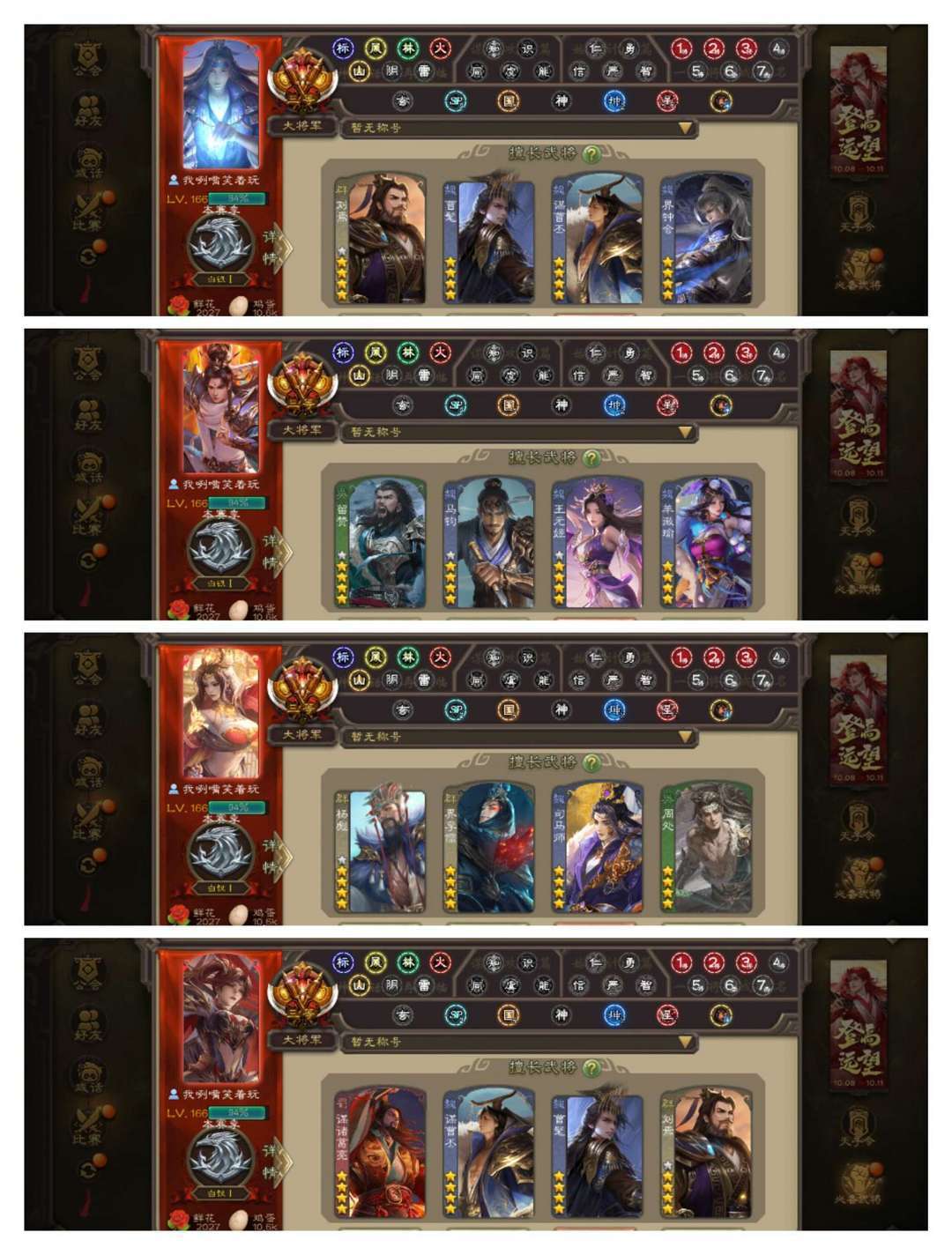 官方三等大将军,无卡,VIP12! 13四星玉龙:回廊双形态动界钟会,回廊动羊徽瑜,回廊动王元姬,回廊动马钧,动刘焉动谋曹丕动谋诸葛亮动留赞,动界李儒动周处动司马师,金杨彪,曹髦! 46史诗武将,回廊动张星彩,动神陆逊动戏志才动王璨,金界徐盛金神赵云金谋夏侯氏金郑玄金星黄忠,界沮授阎象界左慈张琪瑛王朗郝昭等! 44动皮107金皮185国战皮肤!