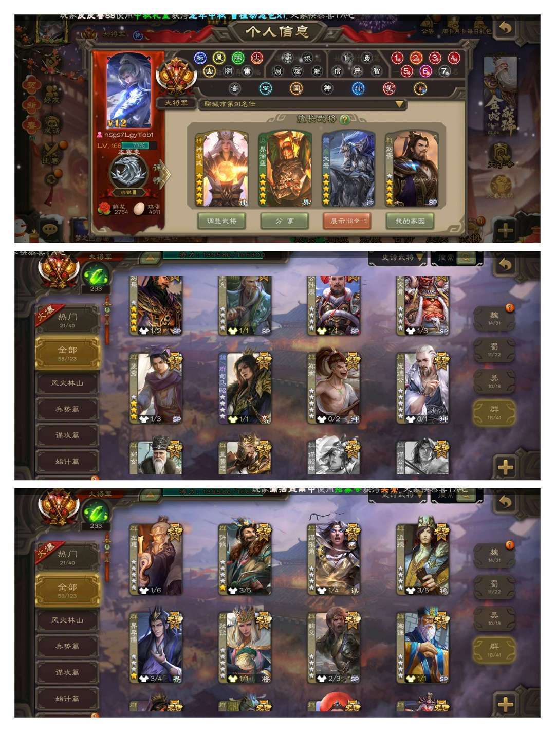 官方二等大将军,无卡,VIP12! 3五星炎龙:回廊动神荀彧,回廊动文鸯,回廊动界徐盛! 1四星玉龙:动刘焉! 58史诗武将:回廊双形态至臻动界钟会,回廊动谋马超,动司马昭动曹婴动王元姬动周处动界李儒,动神郭嘉动神甘宁动神陆逊,动孙寒华动谋关羽动谋诸葛亮动留赞,金戏志才,曹髦裴秀祢衡郑玄,神鲁肃神赵云曹嵩张绣谋小乔! 44动皮125金皮190国战皮肤!