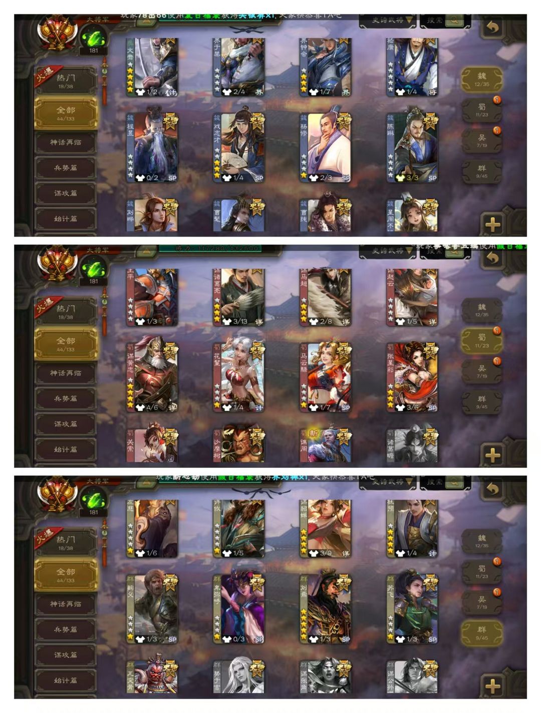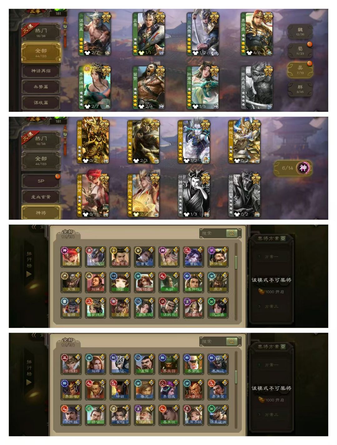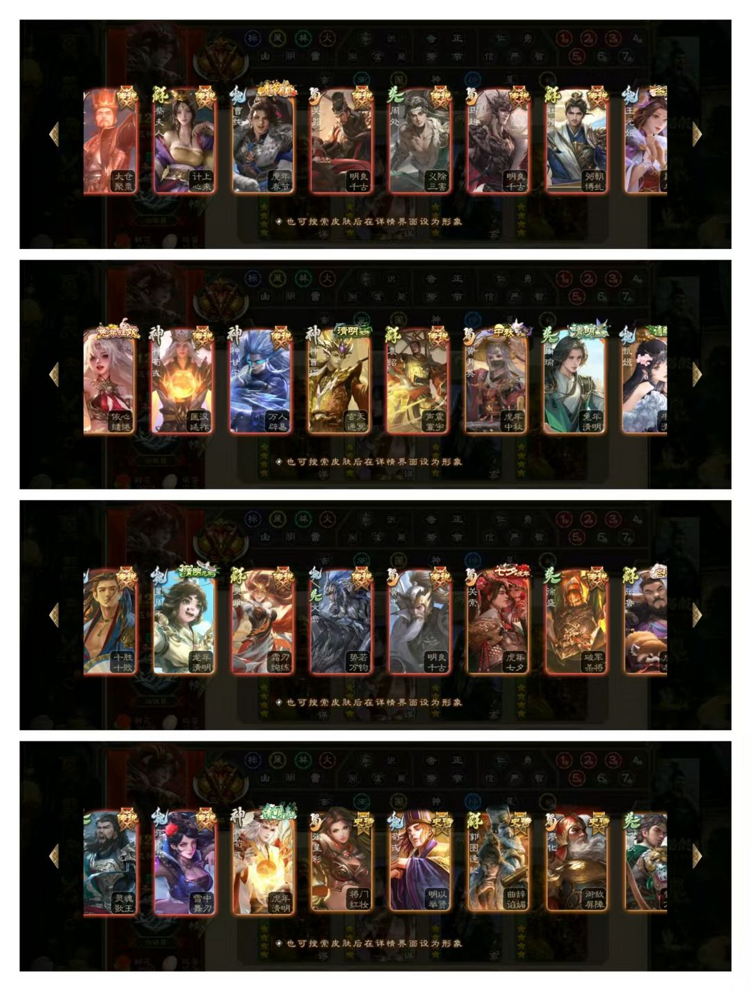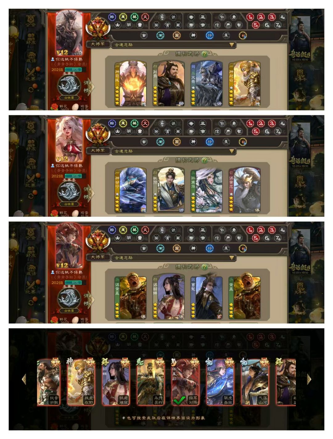 官方三等大将军,无卡,VIP12! 2五星炎龙:回廊动神荀彧! 15四星玉龙:回廊双形态至臻动杜预,回廊动文鸯,回廊动谋黄忠,奇门动谋貂蝉,动刘焉动神甘宁动神赵云,金谋黄盖金孙寒华,曹髦谋诸葛亮! 44史诗武将:回廊动界徐盛,回廊动谋马超,动花鬘动留赞动星周不疑,神孙策界钟会张绣! 35动皮90金皮185国战皮肤!