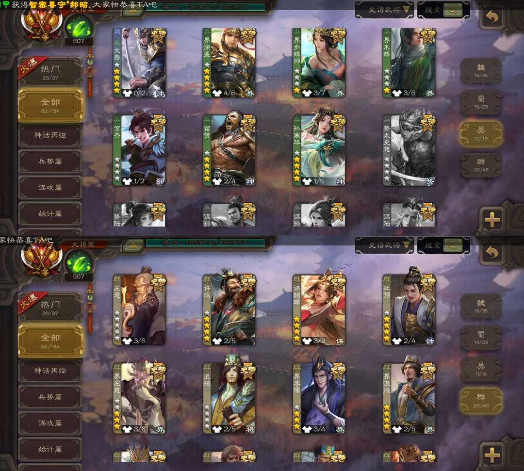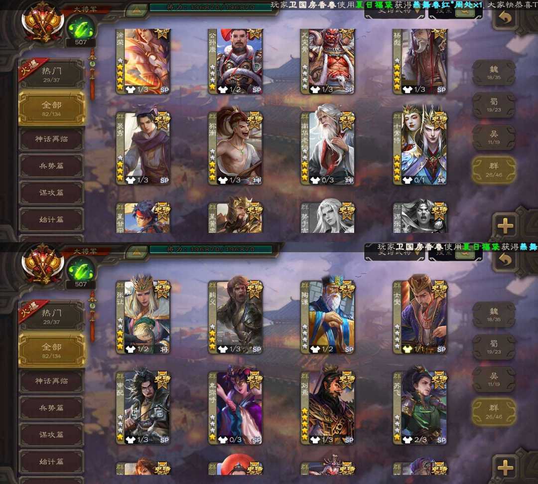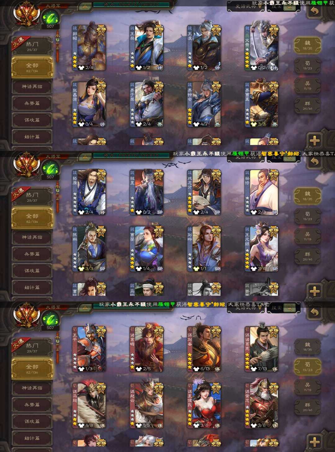 魏:文鸯 张菖蒲 界钟会 戏志才 王元姬 蜀:谋诸葛亮 谋夏侯氏 谋黄忠 谋孙尚香 张星彩 界黄忠 吴:谋黄盖 吴景 界徐盛 界步练师 动态孙寒华 群:动态谋貂蝉 界左慈 界沮授 张让 卑弥呼 刘焉 涂荣 十常侍 神:动态神陆逊 神甘宁 动态神郭嘉 地图神荀彧 动态神孙策