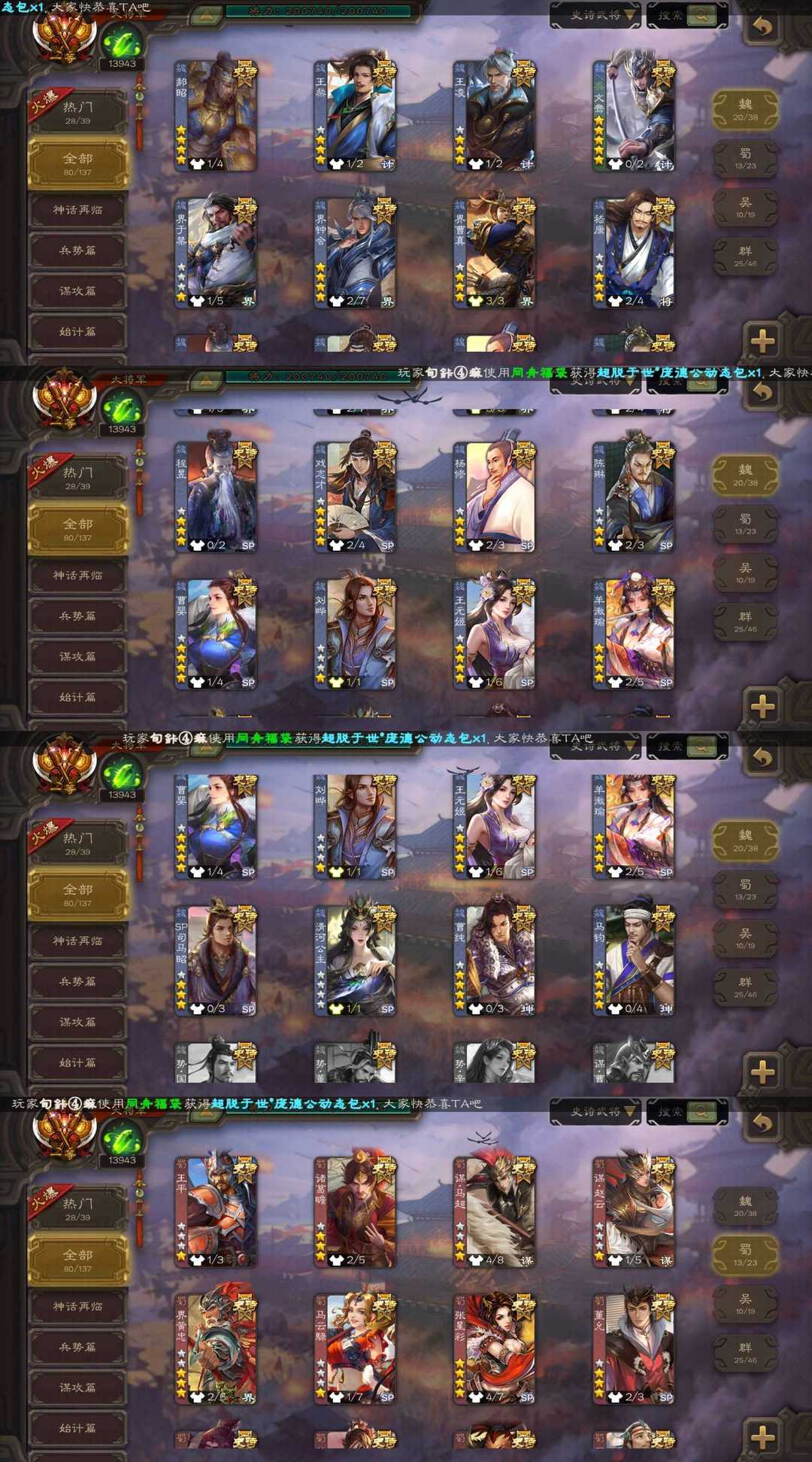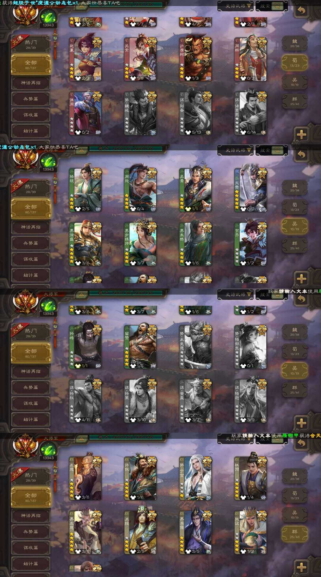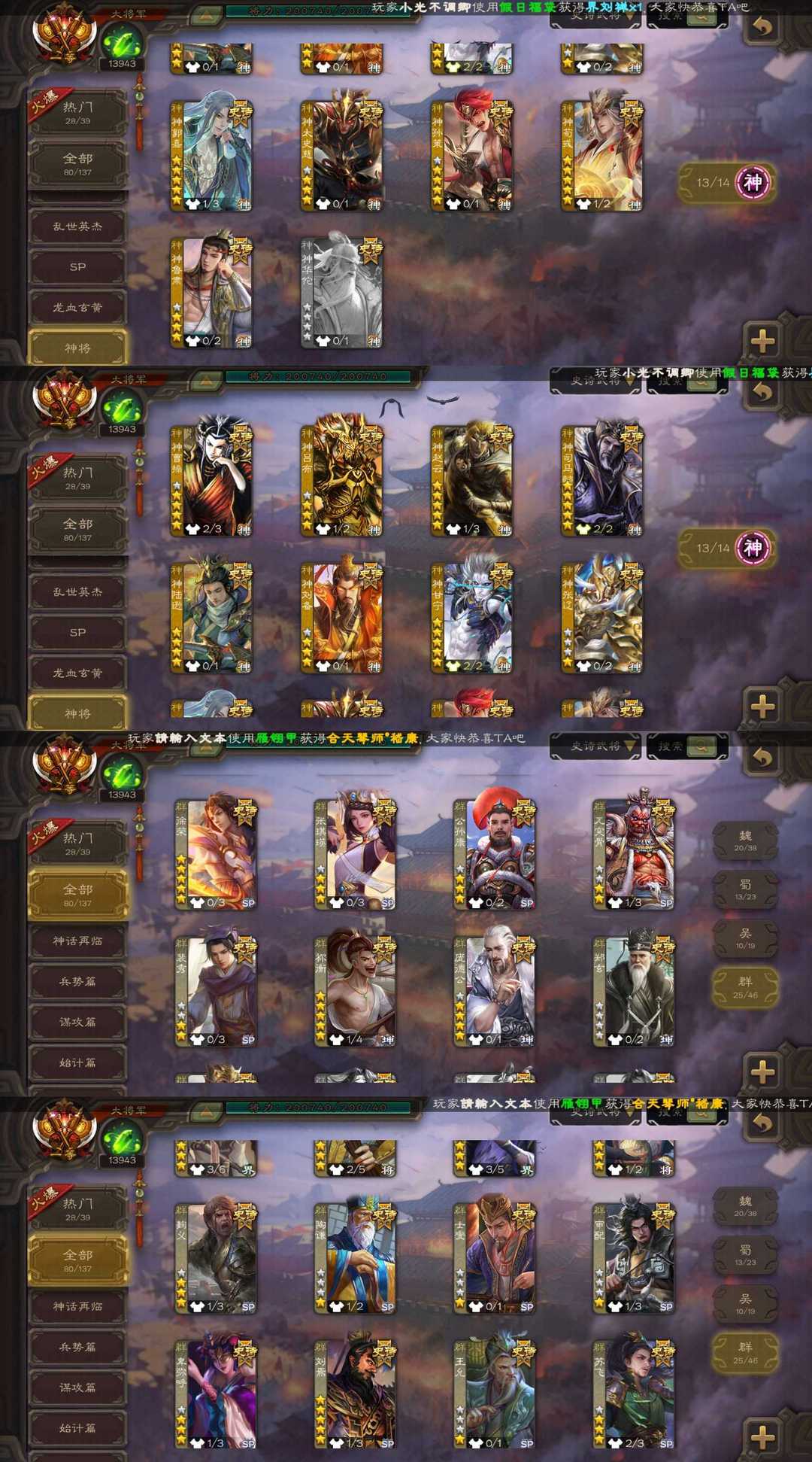 魏:文鸯 界钟会 戏志才 曹婴 羊微瑜 动态清河公主 马钧 蜀:谋赵云 谋马超 谯周 吴:骆统 动态界徐盛 留赞 群:势于吉 杜预 审配 动态刘焉 徐荣 裴秀 祢衡 神:动态神曹贼 动态神司马懿 动态神甘宁 动态神郭嘉 动态神荀彧 神孙策 神鲁肃