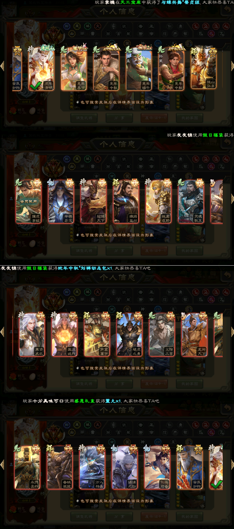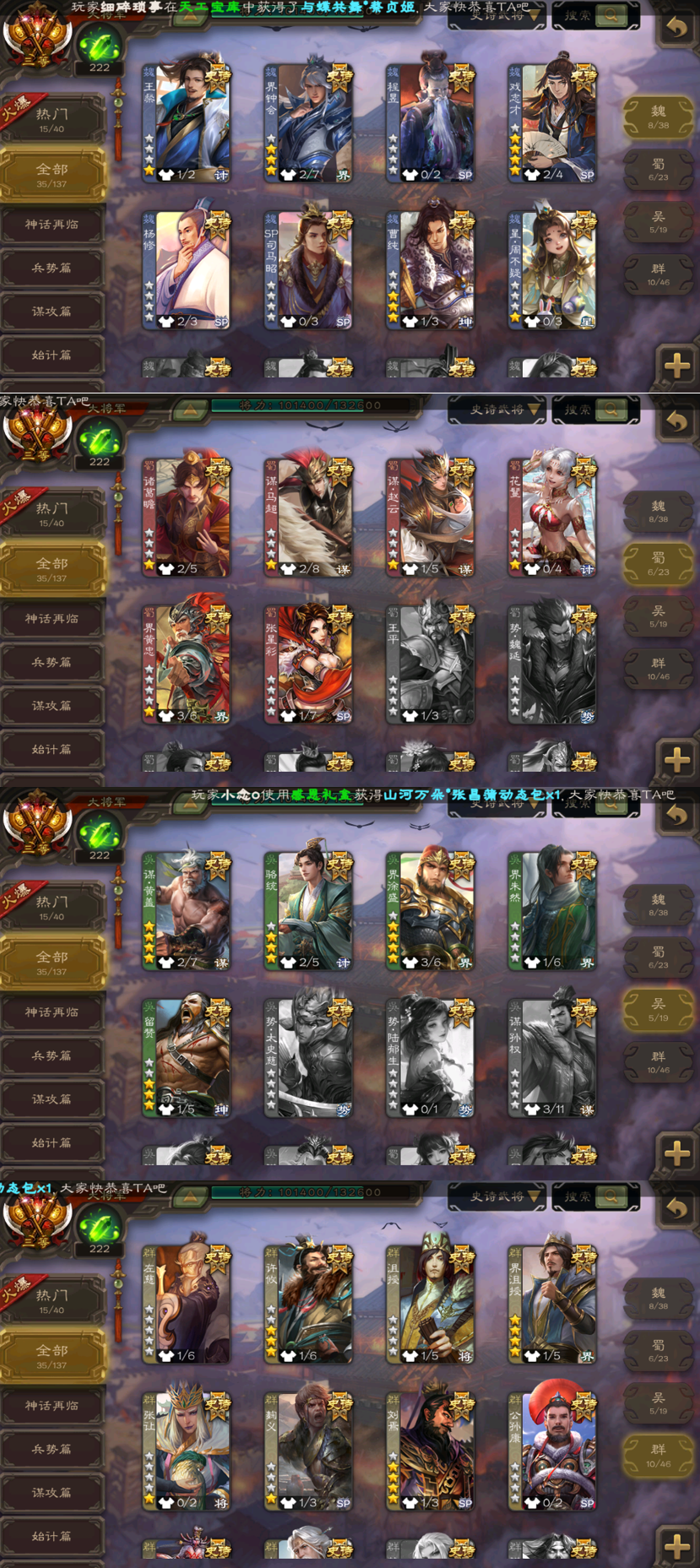◆◆魏◆◆界钟会、戏志才、SP司马昭、星周不疑、曹纯、程昱、王粲、杨修 ◆◆蜀◆◆花鬘、谋马超、张星彩、谋赵云、诸葛瞻、界黄忠 ◆◆吴◆◆界徐盛、谋黄盖、留赞、骆统、界朱然 ◆◆群◆◆界沮授、刘焉、麹义、许攸、南华老仙、张让、左慈、沮授、公孙康、兀突骨 ◆◆神◆◆神荀彧、神甘宁、神赵云、神吕布、神张辽、神刘备