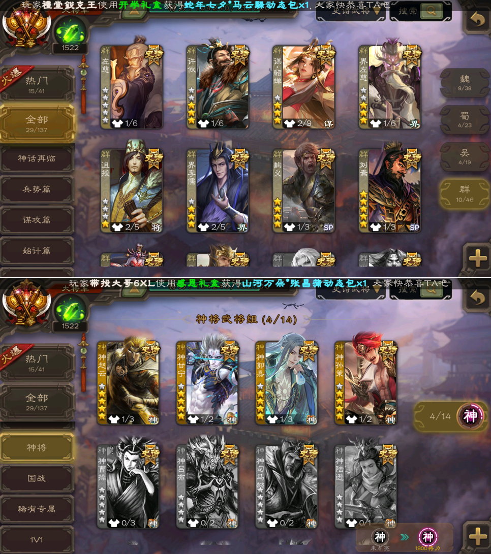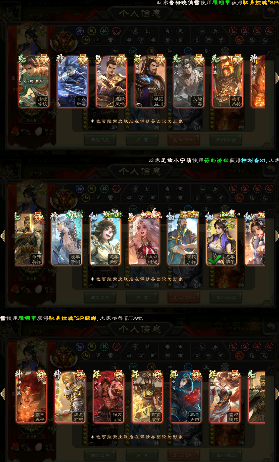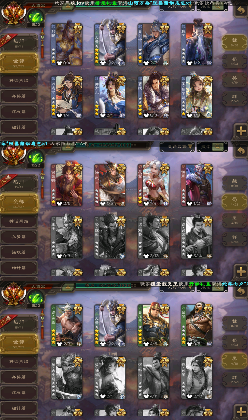 文鸯、界钟会、戏志才、郭女王、星周不疑、曹纯、程昱、郝昭 花鬟、谋赵云、诸葛瞻、谯周 界徐盛、文鸯、谋黄盖、留赞 刘焉、谋貂蝉、麹义、许攸、界左慈、界李儒、星黄忠、左慈、沮授、兀突骨 神郭嘉、神甘宁、神孙策、神赵云