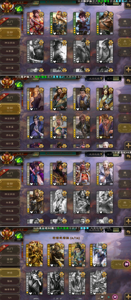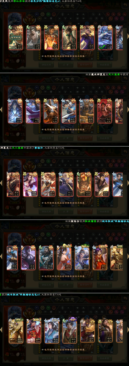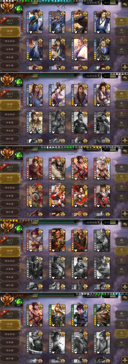 界钟会、戏志才、王元姬、SP司马昭、星周不疑、曹纯、程昱、界曹真、王粲、刘晔、陈琳、杨修、嵇康 花鬟、谋马超、张星彩、傅佥、沙摩柯、谋孙尚香、诸葛瞻、赵襄、界黄忠、董允、马云 界徐盛、留赞、谋孙尚香、贺齐 刘焉、杜预、麹义、许攸、界李儒、星黄忠、卑弥呼、张让、左慈、沮授、庞德公、兀突骨、士燮 神甘宁、神赵云、神吕布、神陆逊、神诸葛亮