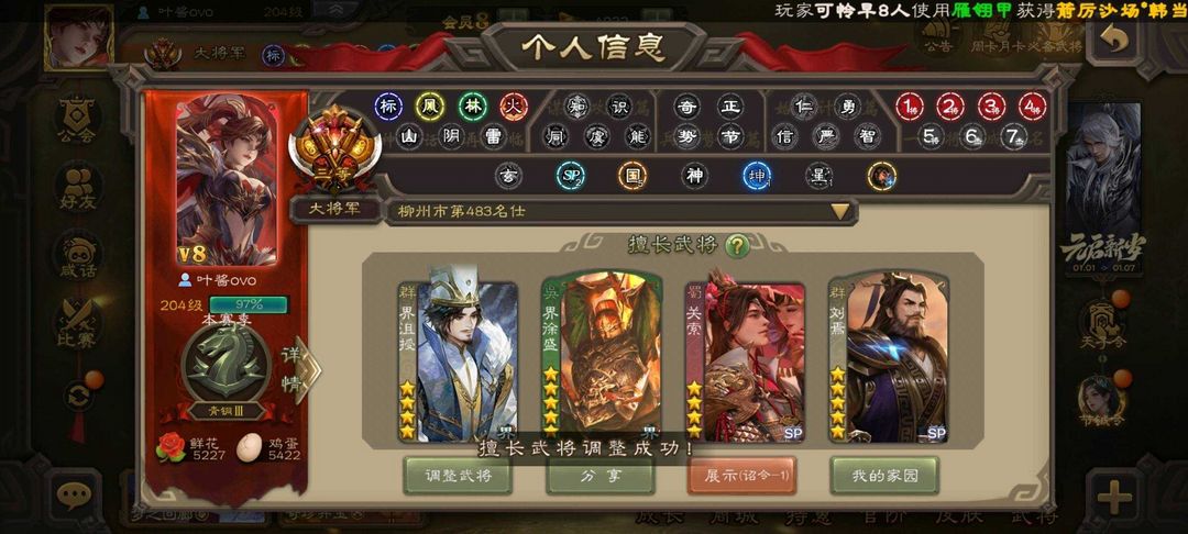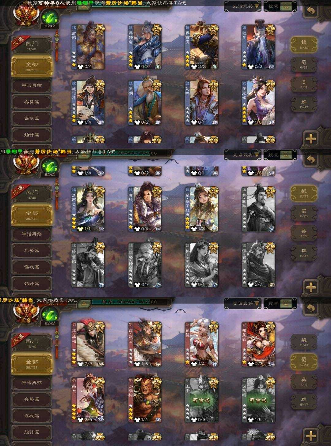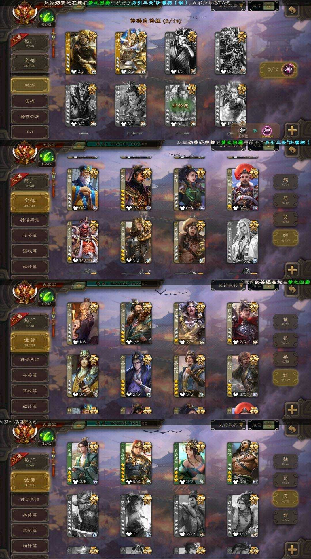 蜀国武将⚡谋马超⚡谋赵云⚡花鬘⚡张星彩⚡关索⚡沙摩柯⚡ 吴国武将⚡骆统⚡界徐盛⚡界步练师⚡留赞⚡ 群雄武将⚡左慈⚡许攸⚡谋张角⚡谋吕布⚡沮授⚡界李儒⚡界沮授⚡麴义⚡陶谦⚡刘焉⚡苏飞⚡公孙康⚡兀突骨⚡星黄忠⚡星董卓⚡ 神将⚡神吕蒙⚡神周瑜⚡神诸葛亮⚡神赵云⚡神张辽⚡ 排位武将110 国战武将95 鼠年冬至-王元姬 临军对阵-张星彩 破军杀将-徐盛 鸠杀少帝-李儒 扬刀立威-麹义 雄踞益州-刘焉