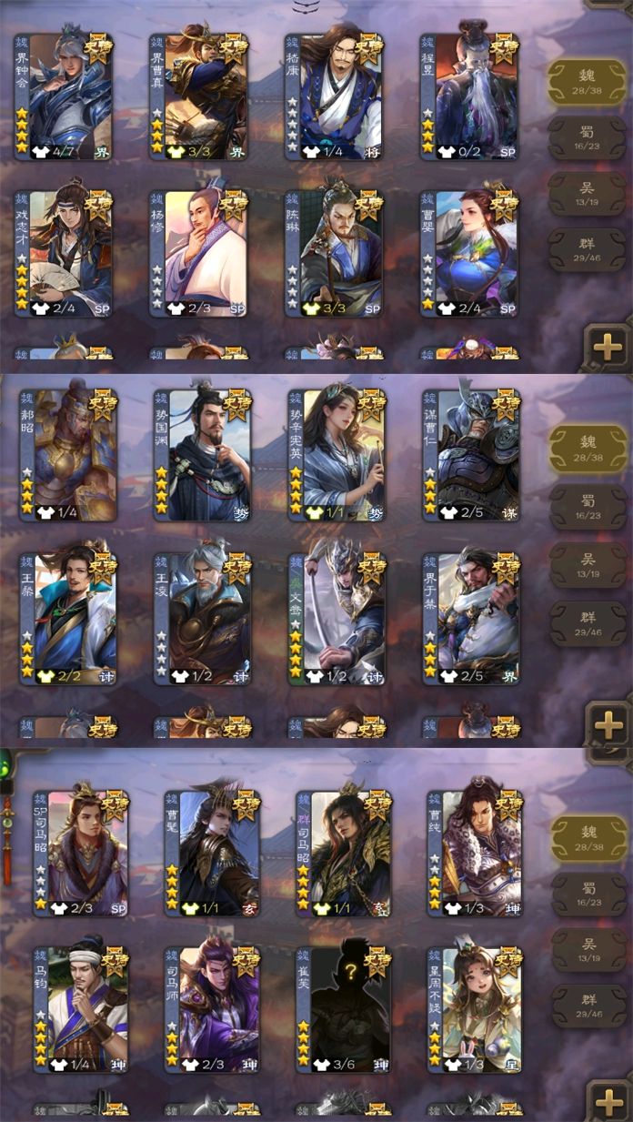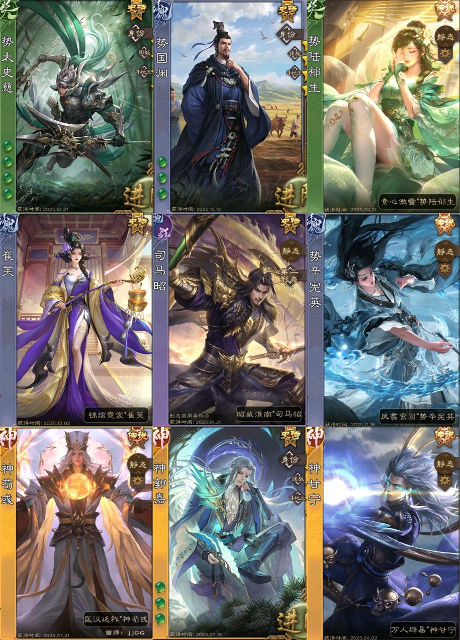 有卡♉新出全氪崔芙势辛宪英势国渊势陆郁生♉一等95史诗♉曹髦枭笼破渊势太史慈新鲍三娘回廊神荀彧动神郭