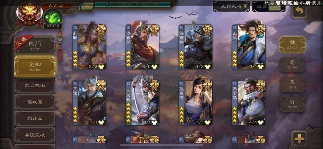 (有卡)一等排行榜1大元帅❤️全灯全扩全武将全满星❤️星周不疑神荀貂蝉新动皮全动皮全回廊39万
