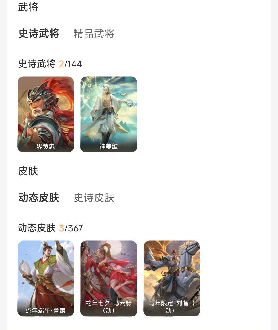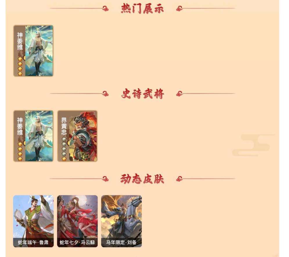 V1,校尉,2史诗武将,3动皮,武将:神姜维,界黄忠,乐进,曹昂,诸葛诞,文聘,曹冲,界曹操,界司马懿,李典,曹真,韩浩史涣,陈群,司马朗,董昭,伏完,伏皇后,李儒,华雄,袁术,公孙渊,星张郃,界公孙瓒,王濬,友庞统,神吕蒙,孙鲁育,程普,韩当,潘璋马忠,虞翻,界黄盖,孙鲁班,朱桓,孙邵,蒋钦,界孙休,马良,关平,简雍,界关兴张苞,界赵云,周仓,张松;热门动皮:蛇年端午·鲁肃(动),蛇年七夕·马云騄(动),马年限定·刘备(动);史诗皮肤:御敌屏障·廖化,桃园结义·刘备,小家碧玉·胡金定,万鸟来朝·卞夫人;