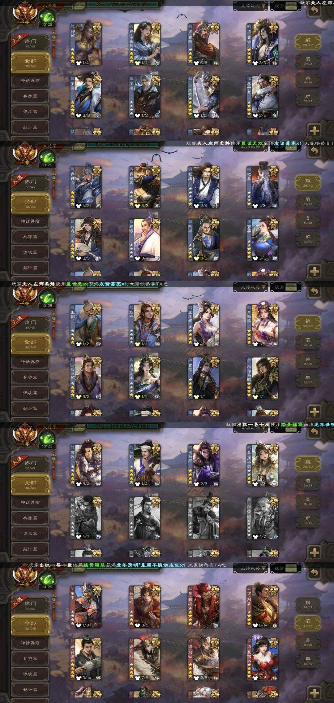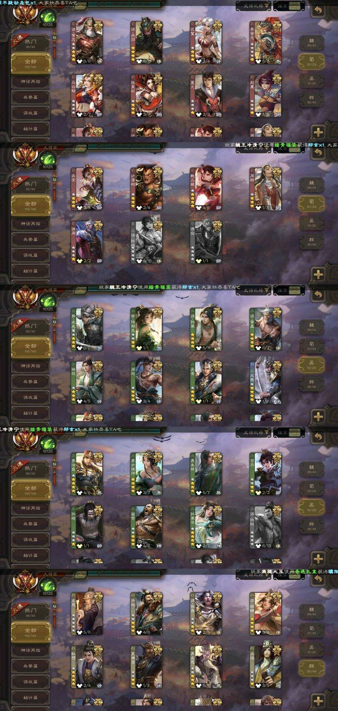 史诗武将(蜀国):势魏延,谋黄忠,谋关羽,谋诸葛亮,鲍三娘,谋赵云,谋夏侯氏,谋刘备,沙摩柯,关索,周群,花鬟,谯周,张星彩,王平,诸葛瞻,界黄忠,马云禄,董允,赵襄,谋马超
