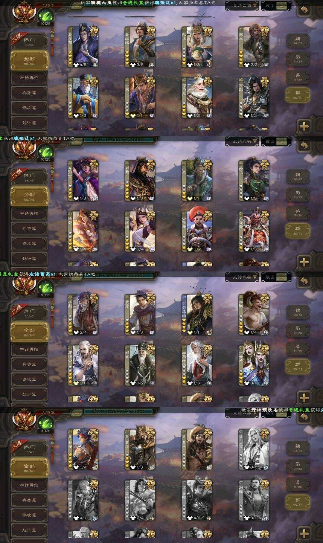 史诗武将(群雄):刘焉,十常侍,星董卓,徐荣,谋貂蝉,杜预,杨彪,界左慈,张琪瑛,祢衡,南华老仙,许攸,麹义,司马昭,谋张角,庞德公,星甘宁,郑玄,皇甫嵩,裴秀,界李儒,星黄忠,界沮授,张让,司马徽,审配,王允,卑弥呼,左慈,兀突骨,沮授,陶谦,士燮,苏飞,公孙康
